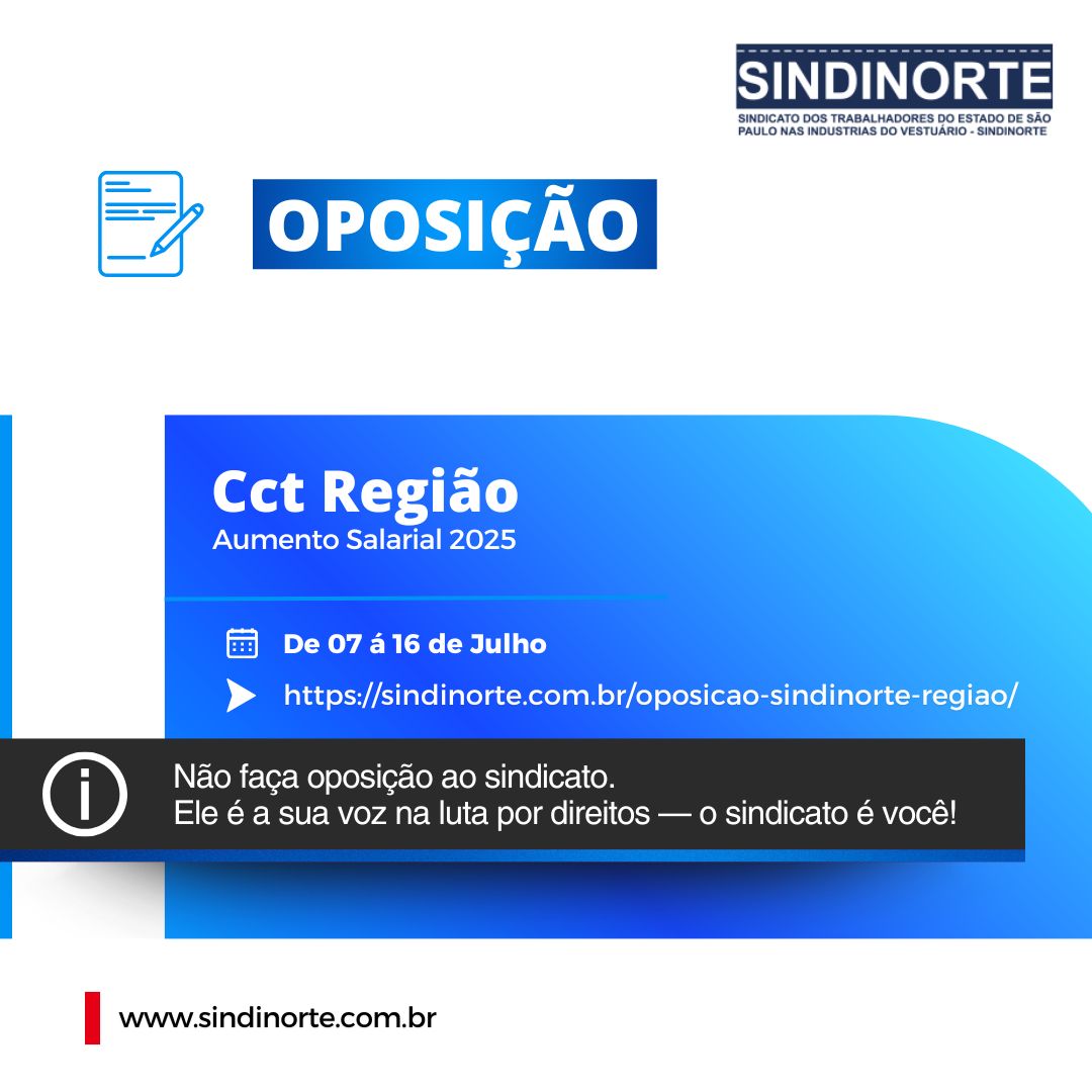 Está aberto o prazo para oposição à contribuição assistencial da Convenção Coletiva Região 2025/2026. 🗓 Prazo: De 07 de junho à 16 de julho de 2025 📌 Como fazer? Basta acessar o link, preencher o formulário e seguir as instruções: 🔗 Veja mais no site: https://sindinorte.com.br/oposicao-sindinorte-regiao/ 📩 O protocolo da oposição será enviado automaticamente para … Ler mais