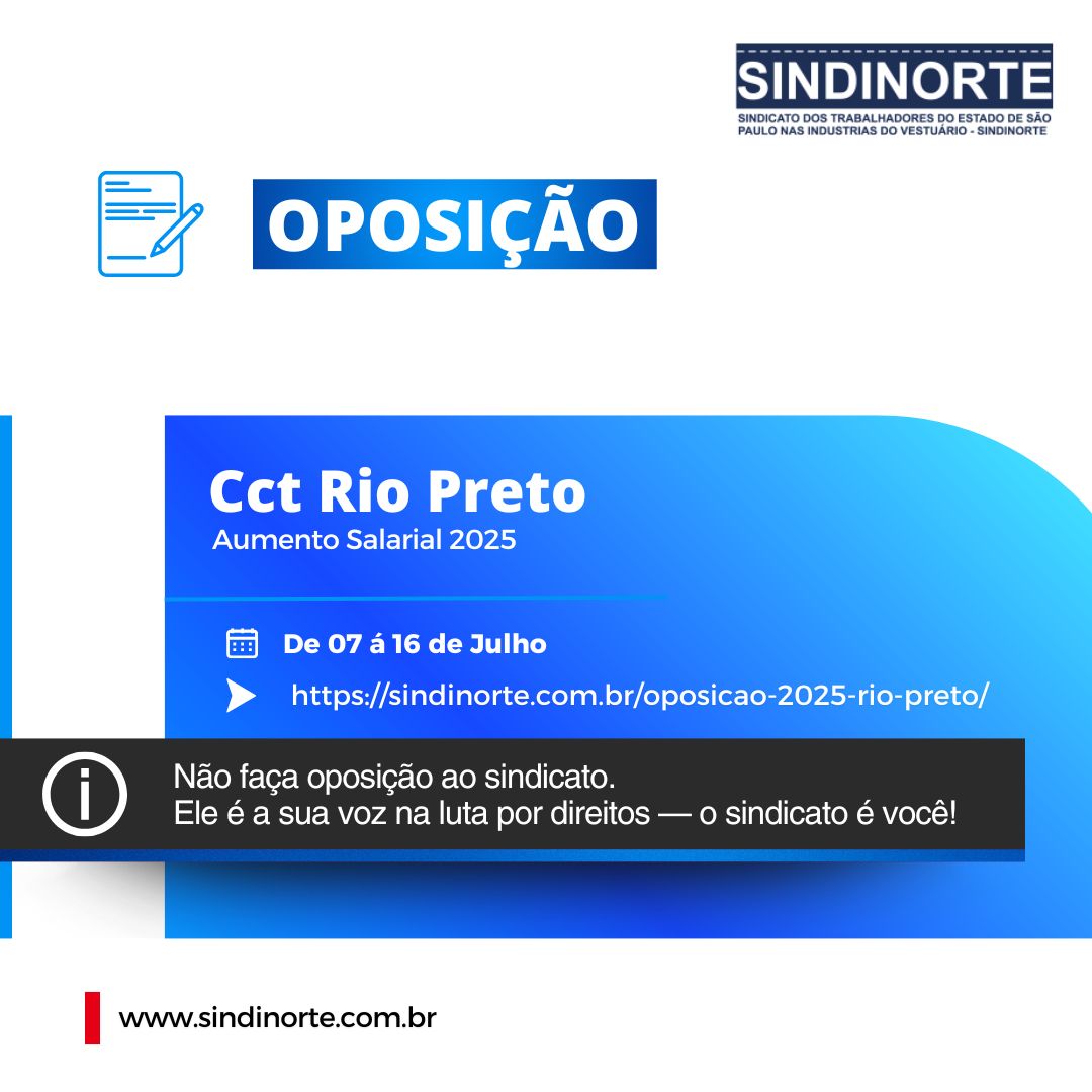 Está aberto o prazo para oposição à contribuição assistencial da Convenção Coletiva Rio Preto 2025/2026. Prazo: De 07 de junho à 16 de julho de 2025 Como fazer? Basta acessar o link, preencher o formulário e seguir as instruções: Veja mais no site: https://sindinorte.com.br/oposicao-2025-rio-preto/ O protocolo da oposição será enviado automaticamente para o e-mail informado … Ler mais